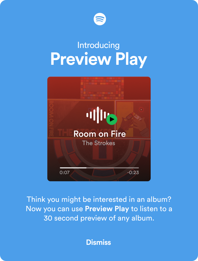 Spotify users now have the option to Preview Play any album they want. Not only will this help users discover new music, but it will also increase recognition of and accessibility to artists’ music that has historically been buried beneath their singles.